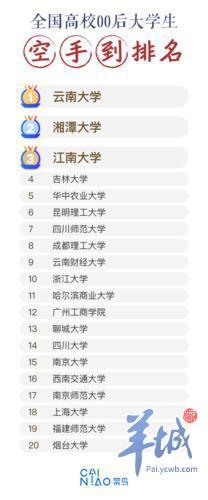 數據顯示,00后空手上學高校排名領先的省份是云南、江蘇、浙江、廣東和四川。這表明比起北方,南方大學生“空手到”功夫更好。