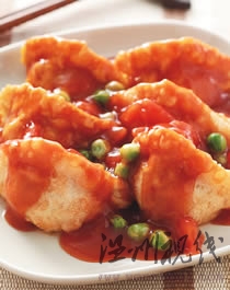 3.熱鍋,加入少許沙拉油,放入作法2的蕃茄丁和碗豆仁下鍋略炒後,加入水、蕃茄醬和細糖,以小火煮至滾沸後,用太白粉水勾芡,先灑上香油,再淋至作法1的餃子上即可。