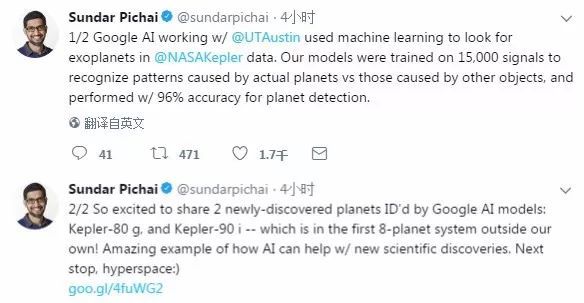 除此以外,此次新發現還有一個最大的亮點,那就是這次的研究成果是與 Google 一起合作完成的。NASA 的科學家使用 Google 機器學習來對開普勒數據進行分析,其效率和準確性遠超傳統的分析方法。據此,NASA 認為 Google 的 AI 技術將有助于在太陽系外探測到外星生命的跡象。