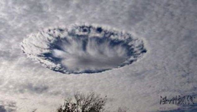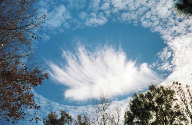 美國氣象研究中心的科學家用觀測飛機拍攝的視頻顯示,一組高積云上的圓洞下方產生了2英寸的降雪。研究人員通過查閱附近機場的航班記錄得出結論,這個穿洞云奇景是一小時前起飛的兩架商務飛機造成的。
