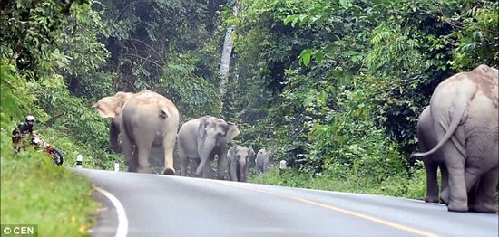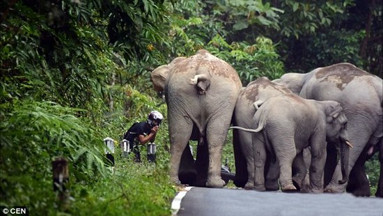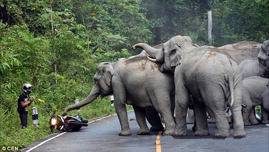 摩托遭大象圍攻:哥們雙手合十,應該是在祈禱
