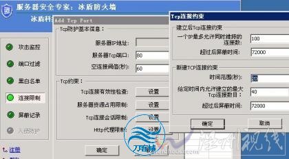 攻擊的原理就不說了,搜索引擎搜索一下就知道了,一般的CC攻擊都是WEB動態頁面發起的,而且會在短時間新建很多TCP端口連接,根據這個特征,我們可以安裝一個DDOS防火墻,設置規則,我使用的是冰盾,如圖所示是我設置的防護CC攻擊規則。