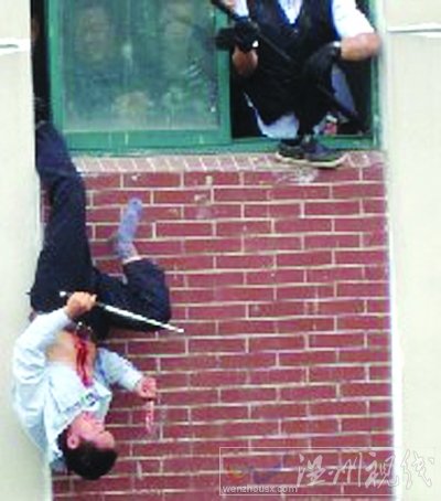犯罪嫌疑人戴某在現場遺落了一把雨傘,據說警方正是根據雨傘的線索找到了端倪,并最終鎖定犯罪嫌疑人正位于離案發地直線距離僅僅500米的棲云苑小區。隨后,警方談判專家以及大批無錫特警全副武裝趕赴該小區。戴某迅速竄至5樓樓道,爬上窗臺并手持兩把尖刀亂舞。雙方對峙了有3個小時,樓下不斷有人勸說其下來。當地網站的一段視頻上記錄下了其墜樓的全過程。視頻剛開始,只見犯罪嫌疑人拿著兩把尖刀坐在五樓的窗臺上神情呆滯。隨后,畫面一轉,戴某一只腳被窗臺卡住,倒掛在空中,手中的刀依舊在揮舞。戴某還用尖刀劃向自己的肚子,頓時鮮血淋漓。11點20分左右,犯罪嫌疑人隨著一聲“啊”的聲音墜下大樓。隨后消防員趕到,將犯罪嫌疑人抬出送到無錫第四人民醫院后,經搶救無效死亡。