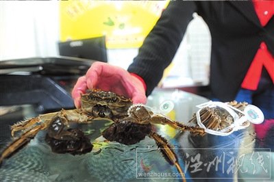 假陽(yáng)澄湖大閘蟹(右)與真品(左)戴著外觀相同的防偽戒指,讓消費(fèi)者很難分辨。