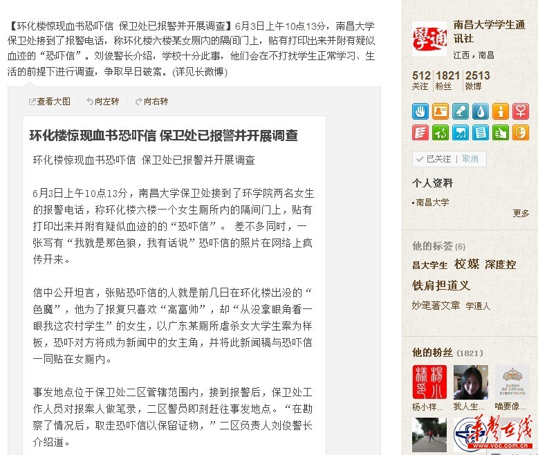偷窺男女廁留血書,南昌大學學生通訊社報道了這一事件