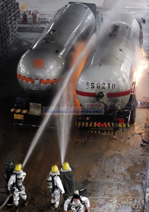 湖南懷化爆炸相關(guān):洛陽(yáng)兩輛液化氣罐車著火,消防員冒死營(yíng)救。