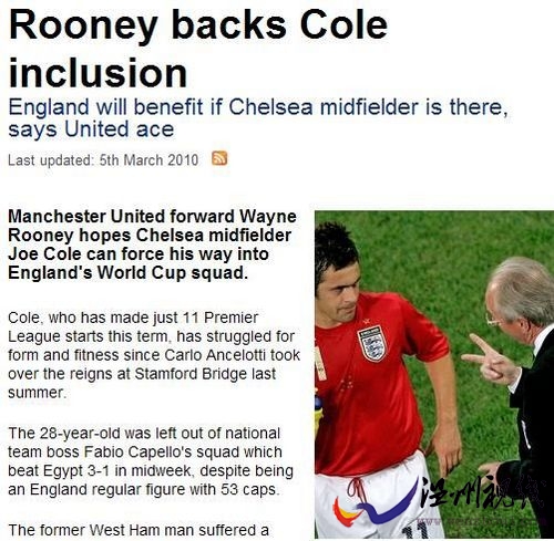 曼聯(lián)前鋒魯尼希望切爾西中場喬科爾能進入英格蘭的世界杯名單,他相信這位曾參加過上屆世界杯的藍軍球員能在南非給“三獅軍團”帶來好處。