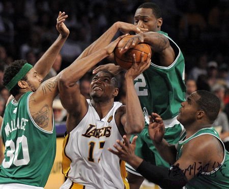 5分54秒,科比跳投不中,拜納姆強(qiáng)勢(shì)摘板后眾人夾防中將球投出,裁判哨響,球進(jìn)!但裁判認(rèn)為進(jìn)球無效,拜納姆急的上竄下跳。暫停后2罰全中,阿倫投進(jìn)本場(chǎng)第6個(gè)3分,拜納姆再次在內(nèi)線制造殺傷2罰1中。拜納姆在短短28秒內(nèi)連續(xù)造成帕金斯2次犯規(guī),湖人在本節(jié)很多時(shí)間竟然要靠拜納姆苦撐局面。本節(jié)末依靠加索爾和科比的連續(xù)打3分,湖人將分差縮小到6分,半場(chǎng)拜納姆得到11分2籃板4蓋帽,除了籃板,還算可圈可點(diǎn)。