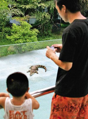 昨天,游客在溫州動物園觀看鱷魚。今年6月中旬,市綠眼睛救助中心將這條受傷的鱷魚送到市動物園,在市動物園精心救治下現(xiàn)已康復。 許日尤 攝