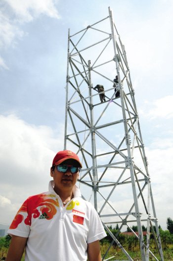 記者看到,在江心西園的一片空地上,五六名工人正在搭建兩個(gè)鐵塔,目前已搭到十幾米的高度。王建光告訴記者,鐵塔的高度為20米,兩端跨度為100米,三根鋼索的直徑為2厘米。屆時(shí),他將騎一輛自行車,雙手各扶一輛自行車,同時(shí)通過鋼索。為了提高挑戰(zhàn)難度和觀賞性,他不會(huì)系安全繩,不過會(huì)在鋼索下方設(shè)置安全防護(hù)網(wǎng)。