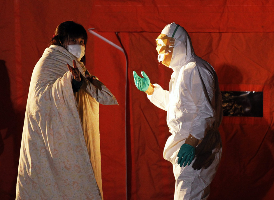 3月13日,日本福島郡山市,工作人員正在檢測一名從福島核電站附近撤離女性身上的輻射情況。3.11地震,日本福島核電站爆炸,日本核電站機組爆炸190人受輻射。