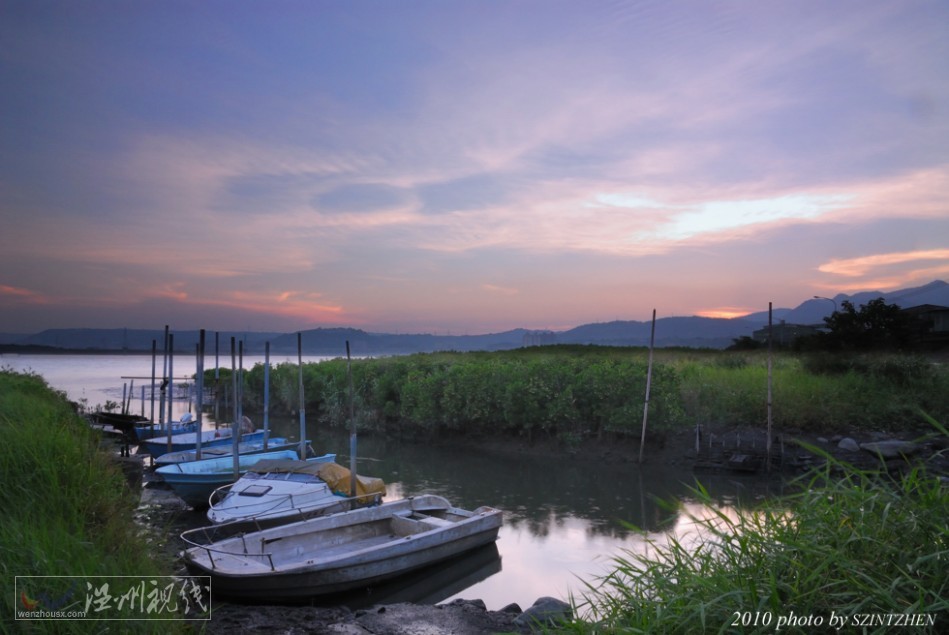 河濱公園看日落風(fēng)景 在金色的晚霞中小游船靜靜的停靠在小碼頭