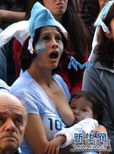 7月3日,在開普敦綠點球場進行的2010南非世界杯四分之一決賽中,阿根廷隊以0比4負于德國隊,慘遭淘汰。當日,在阿根廷首都布宜諾斯艾利斯街頭,一名女球迷對比賽結果吃驚得長大了嘴巴,面容凝滯,甚至連正在給孩子喂奶都忘記了。而她懷抱里正在吃奶的孩子,似乎也受到母親的感染,一邊吮吸著母親的乳汁,一邊瞪大眼睛看著大屏幕里德比賽,臉上顯出的表情,不知是迷惑不解,還是悲傷?唯一知道的,就是小小年紀的他,臉上涂得,是阿根廷國旗的藍白色。