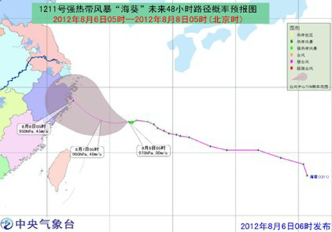 根據(jù)氣象部門預(yù)計(jì),臺風(fēng)海葵將在7日晚上到8日上午在浙江舟山到溫州一帶沿海登陸。在8月6日6時(shí),中央氣象臺發(fā)布臺風(fēng)海葵黃色預(yù)警。
