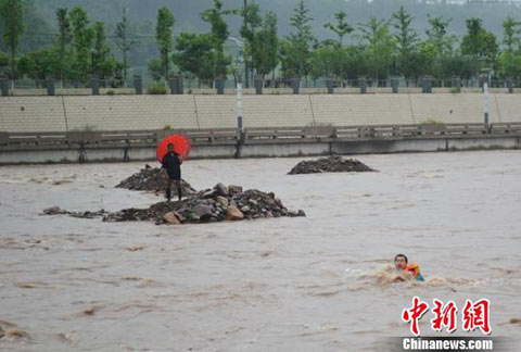 昨日清晨5時,浙江溫州市文成縣一名男子在看守河道整治工地時,洪水突如其來,他只好退到一個沙石丘上等待,可是此時大雨還在一直下,洪水也越來越猛了,河流上游的洪峰一旦爆發(fā)極有可能將男子沖進河里。接到報警后,由文成公安消防局陳偉東政委率隊的21名救援人員即刻趕赴現(xiàn)場。