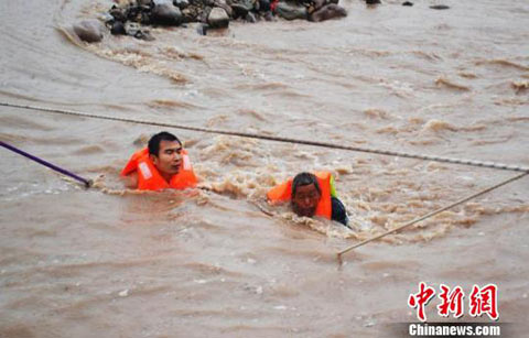 文成老人被洪水困住 圖為消防戰(zhàn)士逐漸靠近被困男子。(王希棟攝)