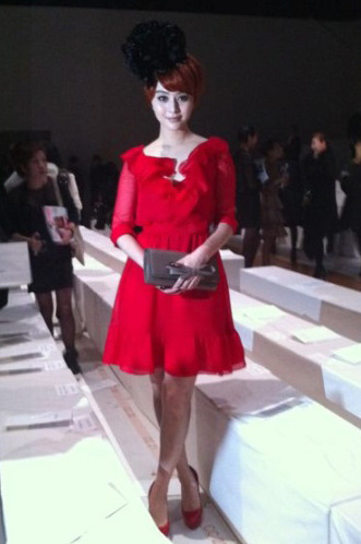 范冰冰現身巴黎時裝周,范美人頭頂蘿莉微露酥胸驚艷巴黎春天。2011巴黎時裝周(秋冬),范冰冰在一品牌秀現場現身助陣。范冰冰一身紅衣,頭頂蘿莉,紅色短發身,顯得嬌俏可愛。不過感覺范冰冰好像對蘿莉是什么意思理解有點偏差,這不是范冰冰的風格,在灰色系的現場確實有一種俗氣和耀眼并存的味道。
