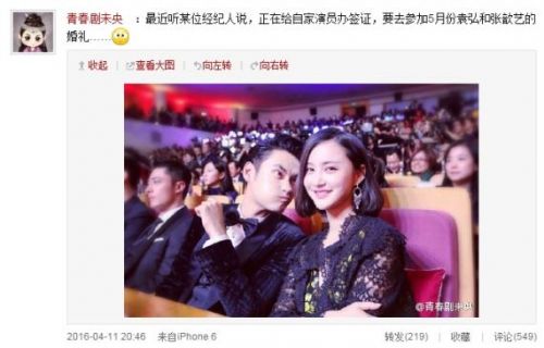 袁弘張歆藝大婚:據媒體報道,2016年5月袁弘和張歆藝要結婚了,知情人透漏,袁弘張歆藝大婚時間已經確定,他們將于5月30日在德國一座古堡舉行婚禮,好浪漫的婚禮。