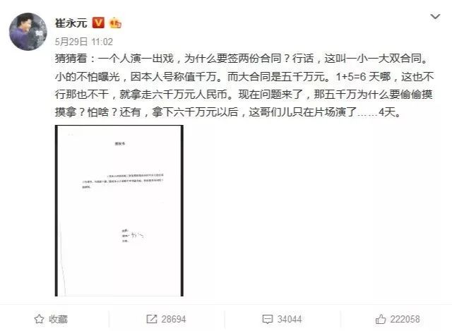 最常見的,可能就是崔永元所揭發的“陰陽合同”問題:明星拿到天價的出場費,但是本著“友好合作”的精神,在合同上標注的金額要小很多,只是象征性的。這種“友好合作”,最后催生出一種圈子文化。既然大家都在這個圈子討生活,就需要共同維護這種潛規則。